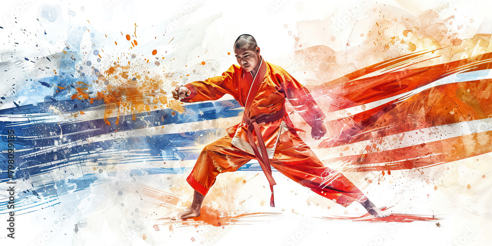 Thai Flag with a Muay Thai Fighter and a Buddhist Monk - Picture the Thai flag with a Muay Thai fighter representing Thailand's martial arts and a Buddhist monk #798099135