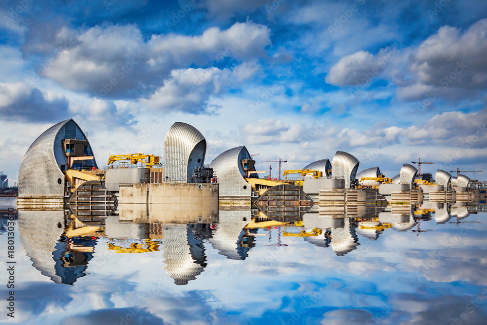 Thames Barrier reflected in the River Thames, London, UK #1801303610