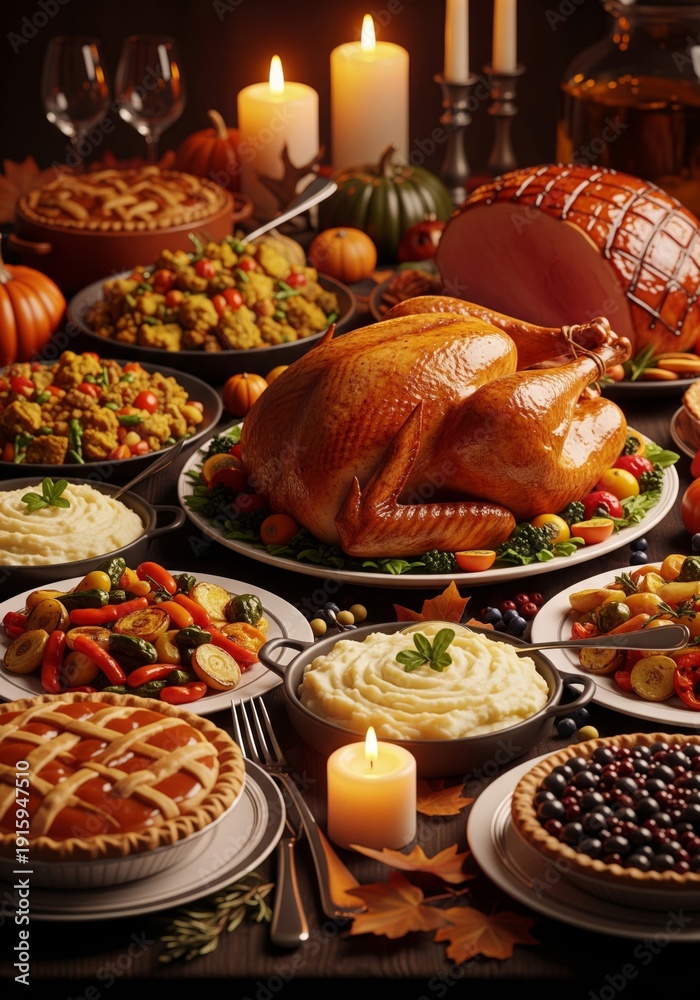 Thanksgiving Feast Tabletop Still Life with Turkey and Fall Colors #1915947510