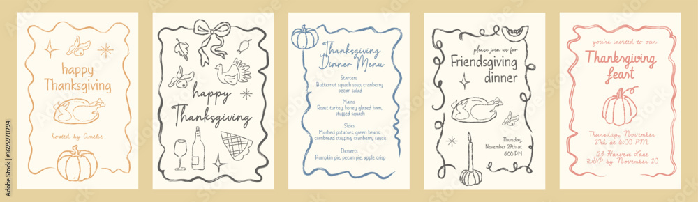 Thanksgiving invitation with turkey, pumpkin and festive autumn dinner feast elements. Holiday menu, harvest food celebration and Friendsgiving party card design. Flat vector illustration. #1695970294