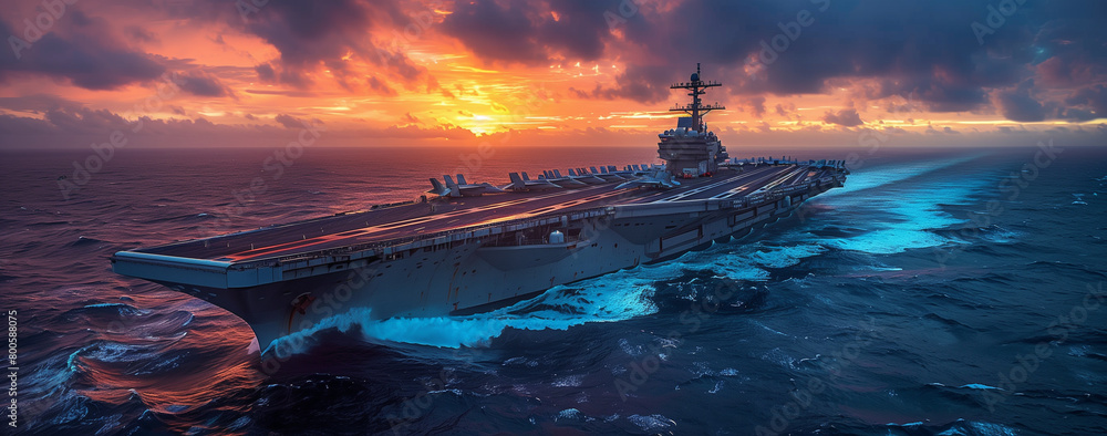 the aircraft carrier is anchored at sunset in the water, #800588075