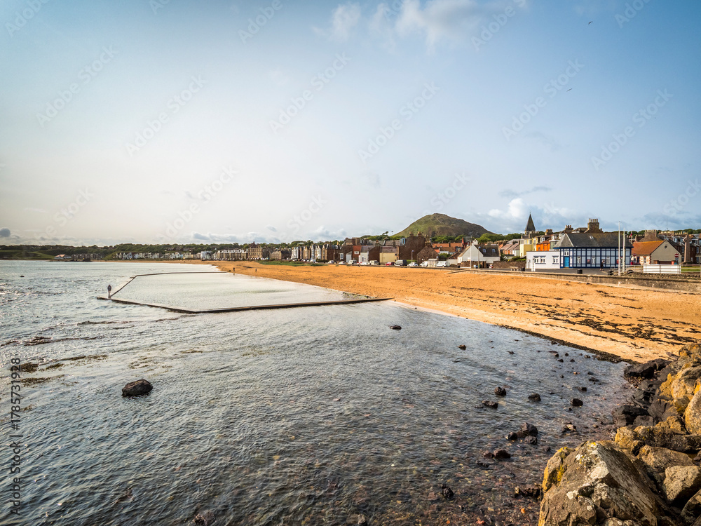 The beach at North Berwick Cove, East Lothian, Scotland, with the tidal swimming pool and Berwick Law hill in the background. #1785731928