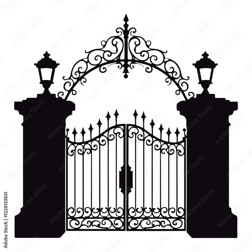 The black silhouette of the wrought iron gate is attractive and ornamental. Vector silhouette of decorative ornamental iron #1228133831