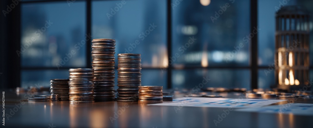 The coins stacked high representing financial growth and investment potential. #1604278448