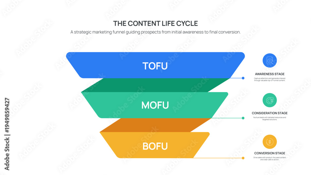 The Content Life Cycle Infographic Vector. Marketing funnel diagram showing TOFU, MOFU, and BOFU stages. Strategic visual template for digital marketers to plan sales conversions Presentation Slide. #1949859427