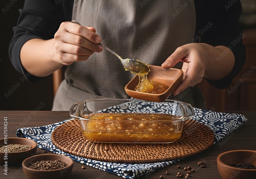 The cook carefully pours flavorful homemade jam into a glass dish using a spoon, creating a delicious culinary experience at a wooden kitchen table with natural light for sharing, inviting #1967598241