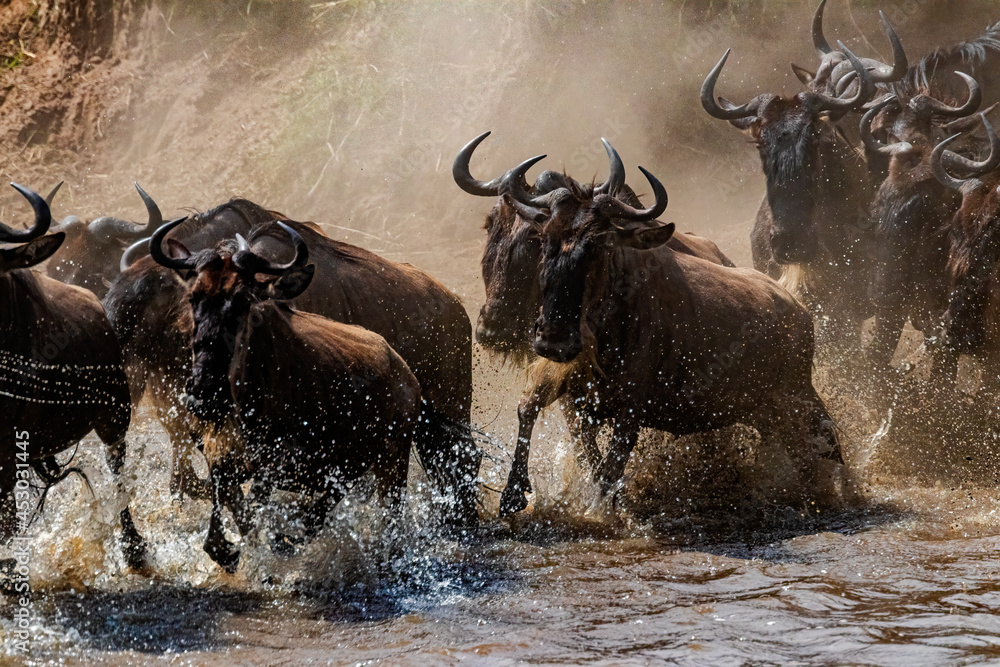 The crossing starts and the panic begins. as Wildebeest begin to cross the Mara River in Tanzania during the yearly migration. #453031445
