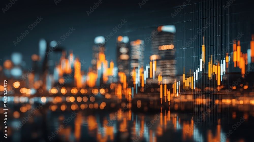 The dynamic financial graph overlaying a vibrant urban skyline at night. #1552045972