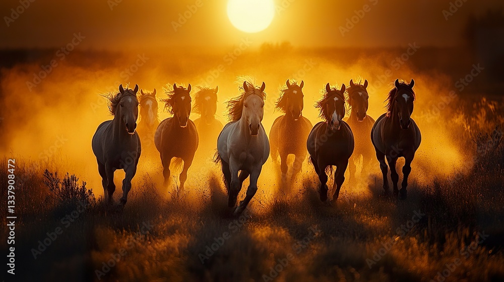 The energy of seven galloping horses fills the frame, their manes flowing wildly as they charge forward, kicking up dust under the golden sun, cinematic action shot. #1337908472
