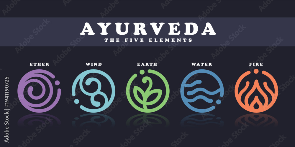 The Five elements of Ayurveda - Ether Wind Water Fire and Earth with line circle shape and dot symbol vector design #1941190725