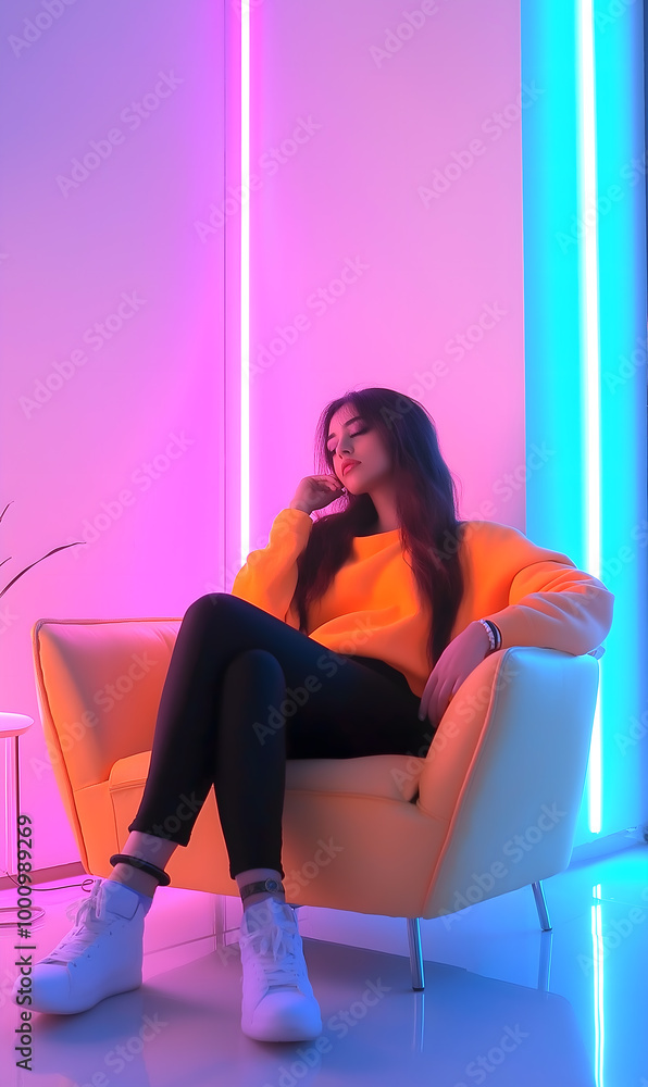 The girl blogger sits in her studio, tired after a long day of filming. The neon light softly and warmly illuminates the room, but the signs of fatigue are evident on her face. #1000989269