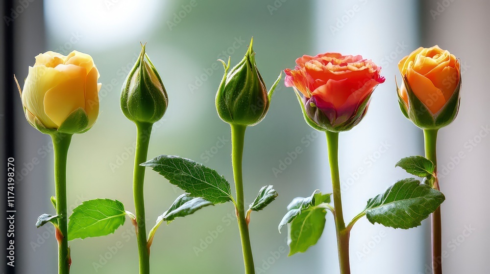 The growth of new flowers emerge from bud to bloom as sunlight shines in the early morning #1174198270