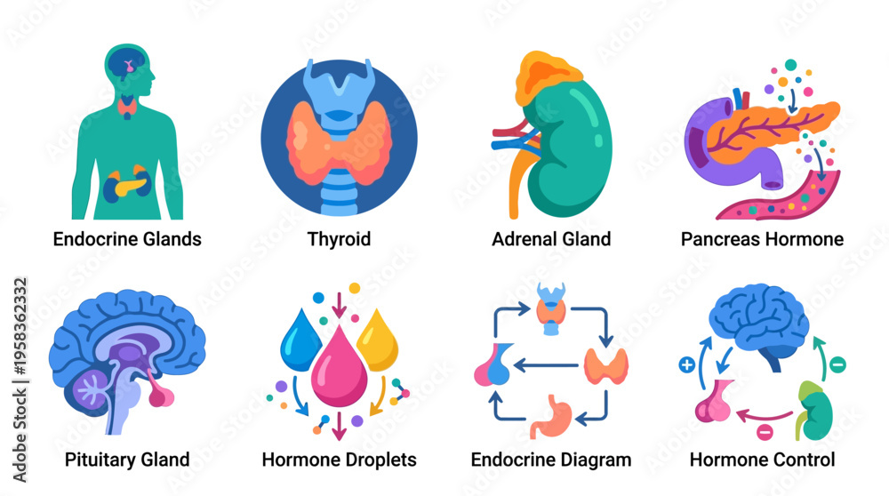 The human endocrine system consists of vector graphics illustrating glands like thyroid, adrenal, pancreas, pituitary, and hormone droplets. #1958362332