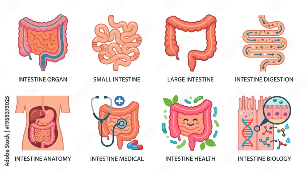The human intestine organ system with vector illustrations of small and large intestine digestion and health in medical biology. #1958373025