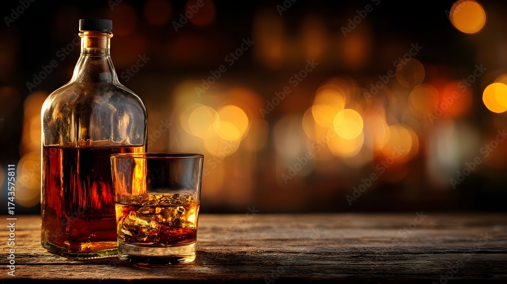 The image features a glass bottle and a tumbler of amber liquid with ice cubes resting on a weathered wooden surface. #1743575811
