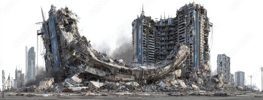 The image of a ruined city, with a building destroyed in the war, is presented as a 3d rendering in png format, featuring a transparent background, clip art, and cut-out elements, all set after an #1531013890