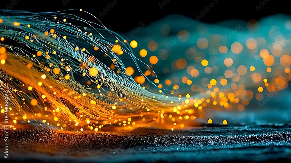 the image presents a dark, textured landscape with ethereal elements. numerous luminous orbs float along thin, flowing lines, giving the impression of energy or light streams #1676888427