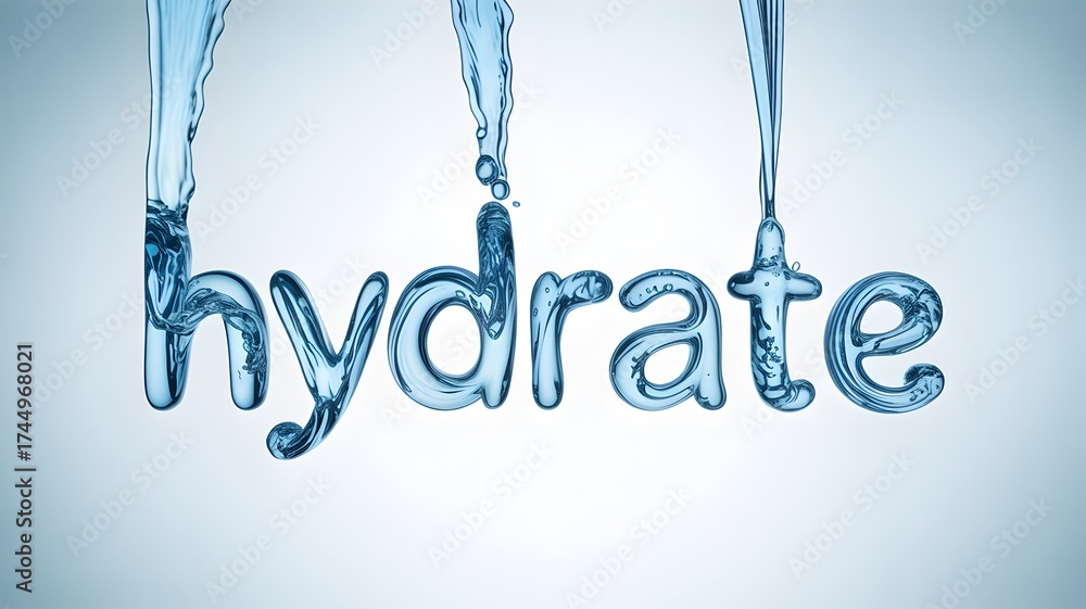 The image shows the word 'hydrate' made of water, emphasizing the importance of hydration. #1744968021