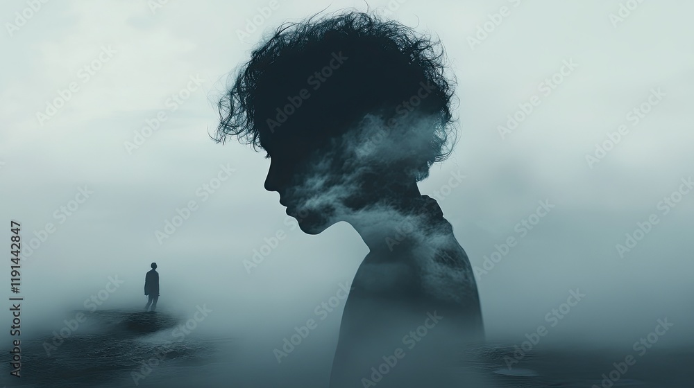 The large head of a woman is surrounded by thick fog and looks at the small figure of a man. Concept of memories of people who have passed away. Illustration for cover, card, interior design, decor. #1191442847