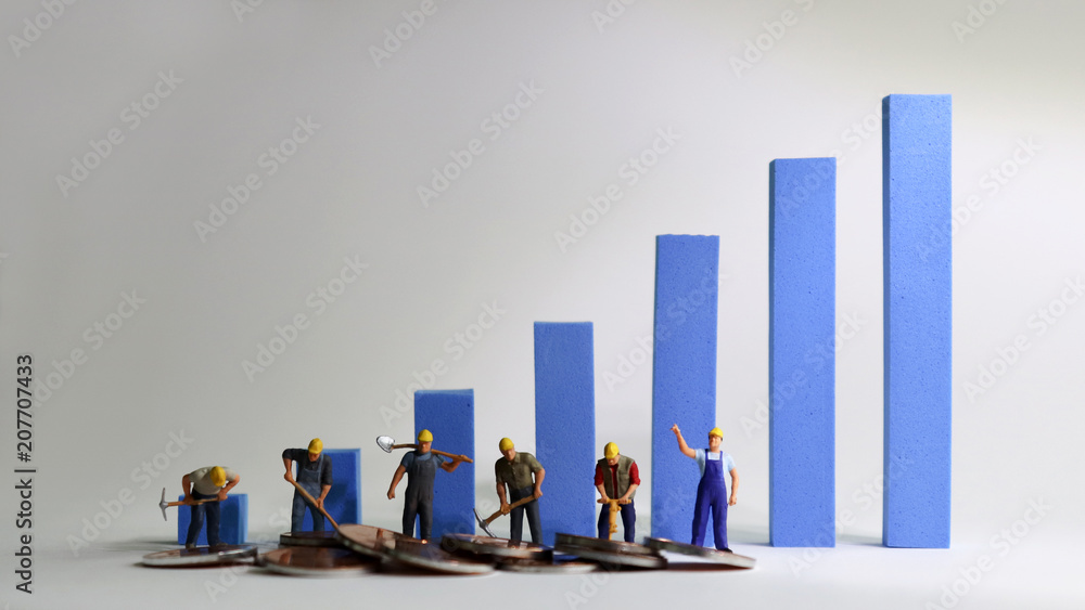 The miniature workers standing on a blue bar graph. Minimum wage increase concept. #207707433