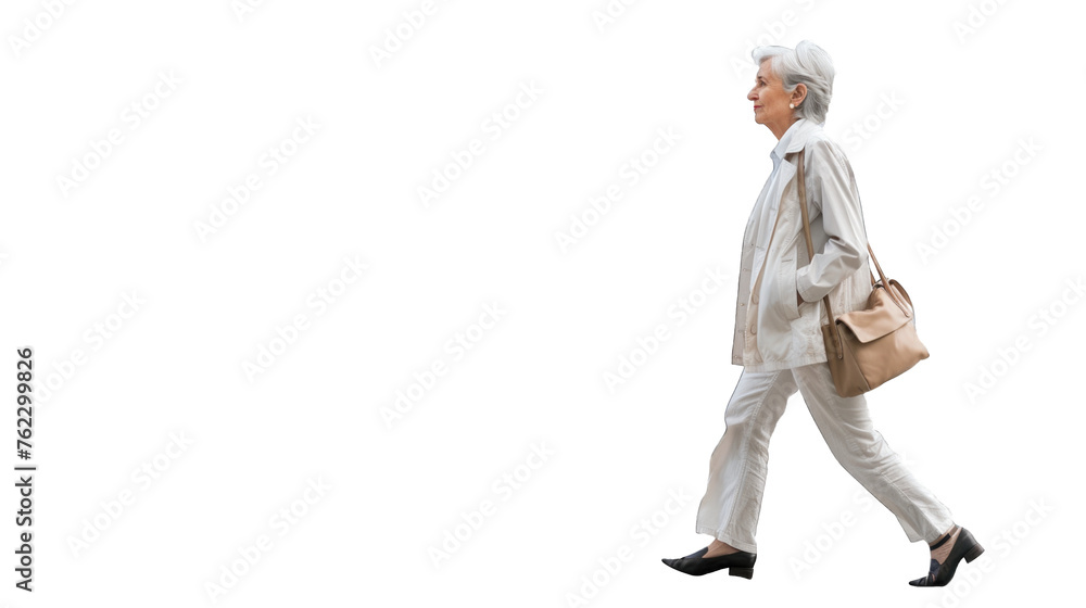The modern elderly woman walks with a light gait. PNG file of isolated cutout object on transparent background. #762299826