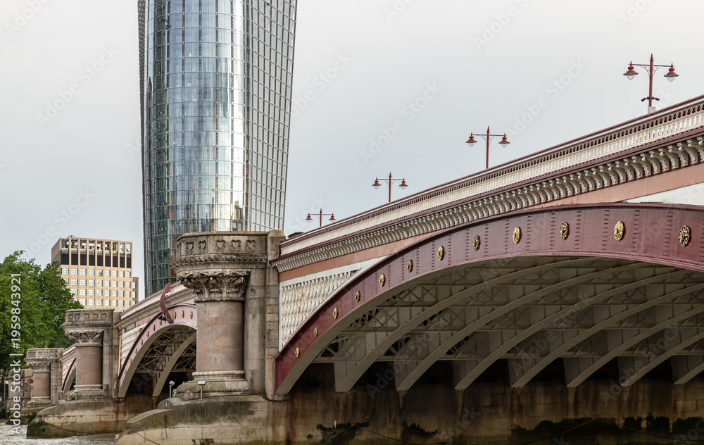 The ornate, scarlet-hued arches of Blackfriars Bridge sweep gracefully across the frame, their Victorian grandeur punctuated by golden medallions and classical stone piers. In the background, the shim #1959843921