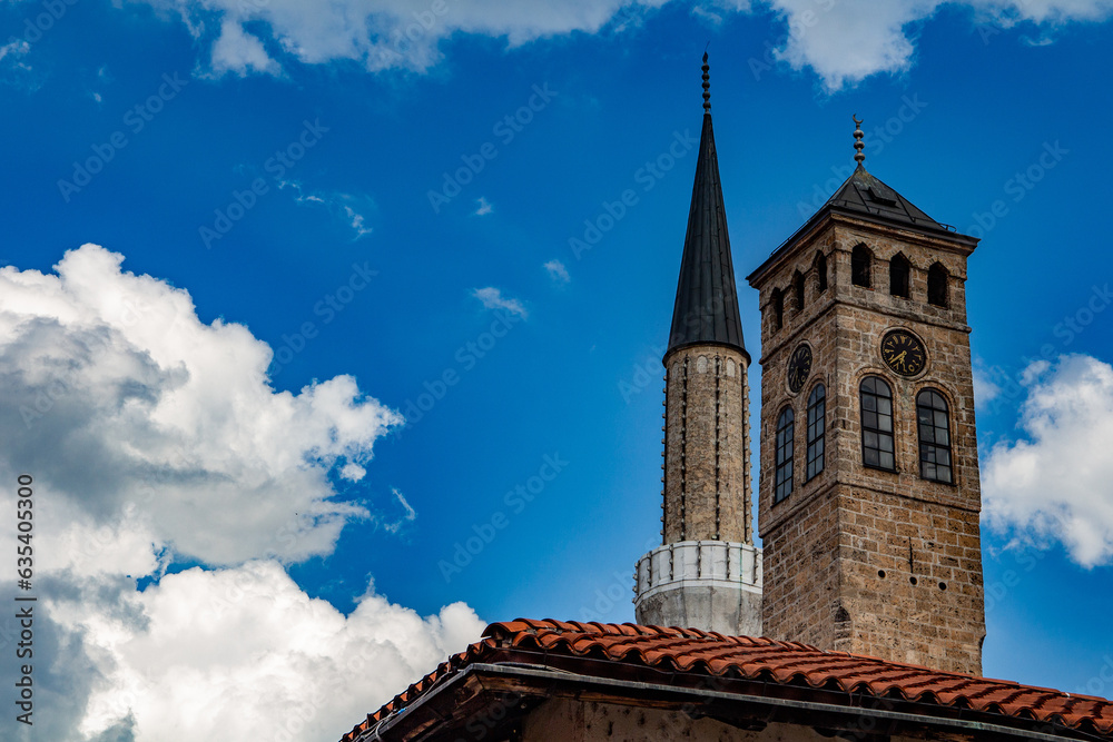 The Ottoman Era Clock Tower and the minaret in the old town of Sarajevo #635405300