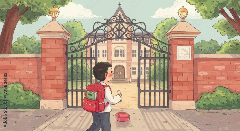 The Path to Education: A young student walks confidently towards the entrance of a grand building of institution , carrying his backpack. #1728806183