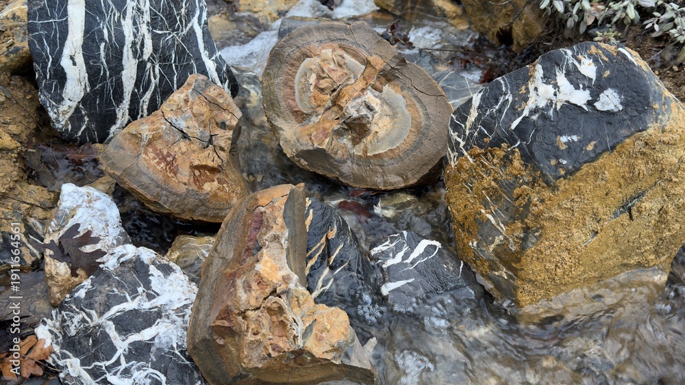 The patterns, colors, and variety of ore content on the stones in the streambeds are indicators that gold may be present. #1911664561