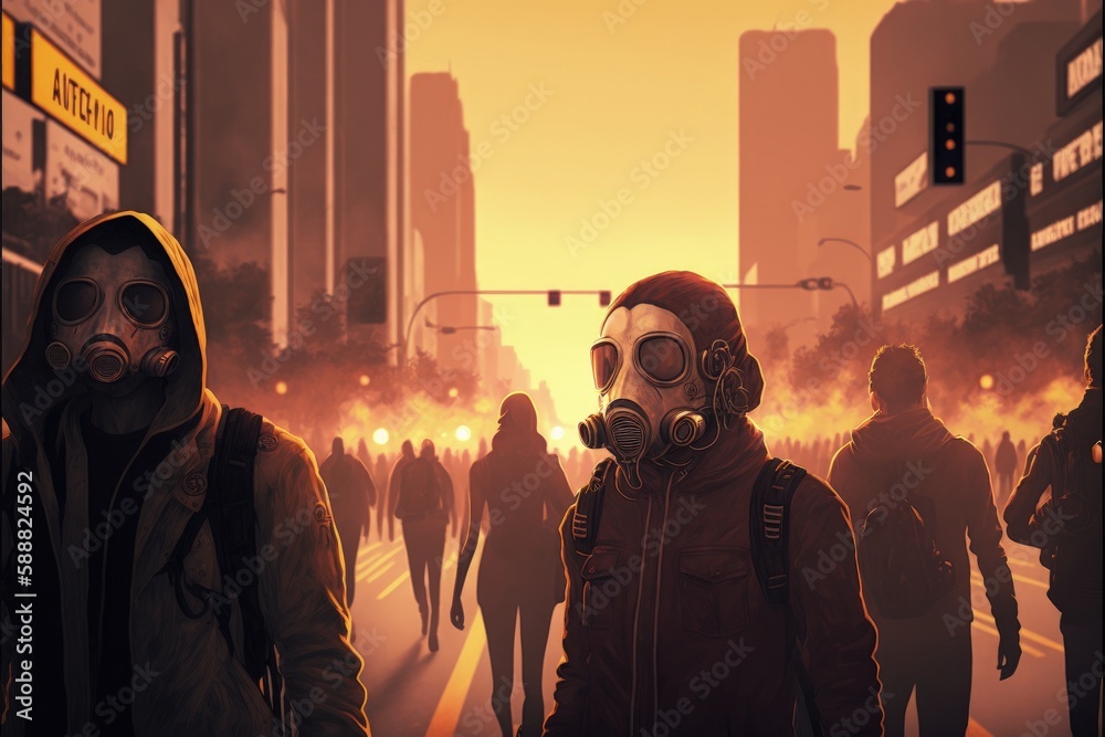 The people in gas masks walk on the street of the futuristic city at sunset, the air thick with pollution and danger. Fantasy concept , Illustration painting. Generative AI #588824592