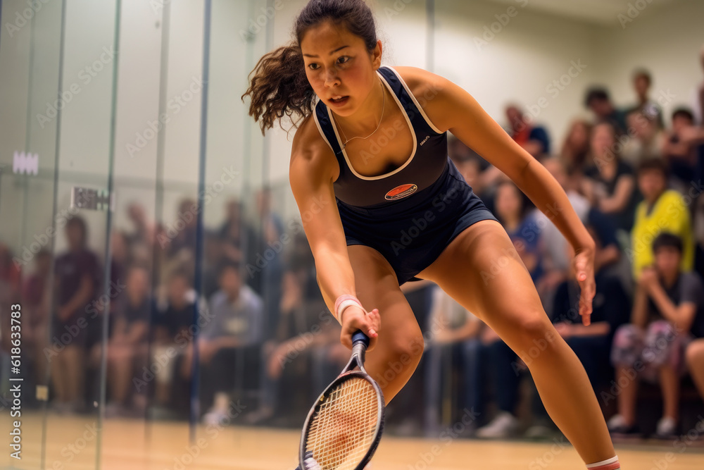 The precise moment a racquetball ricochets off the court wall, a scene full of potential energy just before the dynamics of the game change #618633783