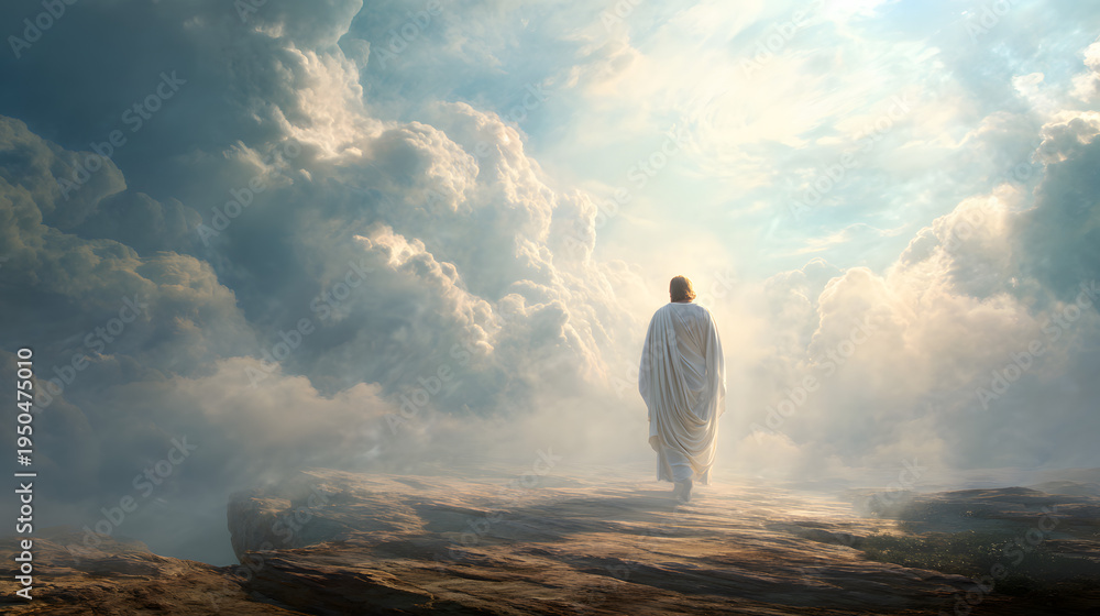 The resurrected Jesus ascending into heaven before the apostles as Christ rises into silent glory while the apostles remain below suspended in a moment of sacred stillness and emotional reverence, #1950475010
