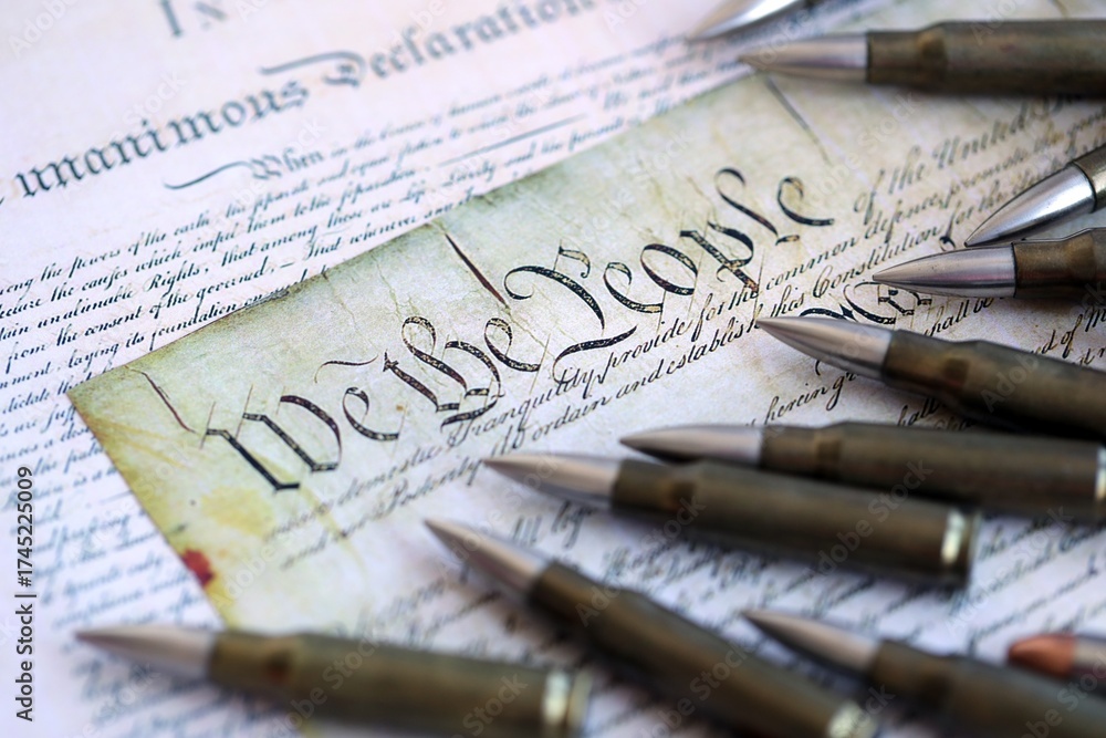 The second amendment and gun control in america concept. Bullets on american constitution #1745225009