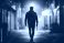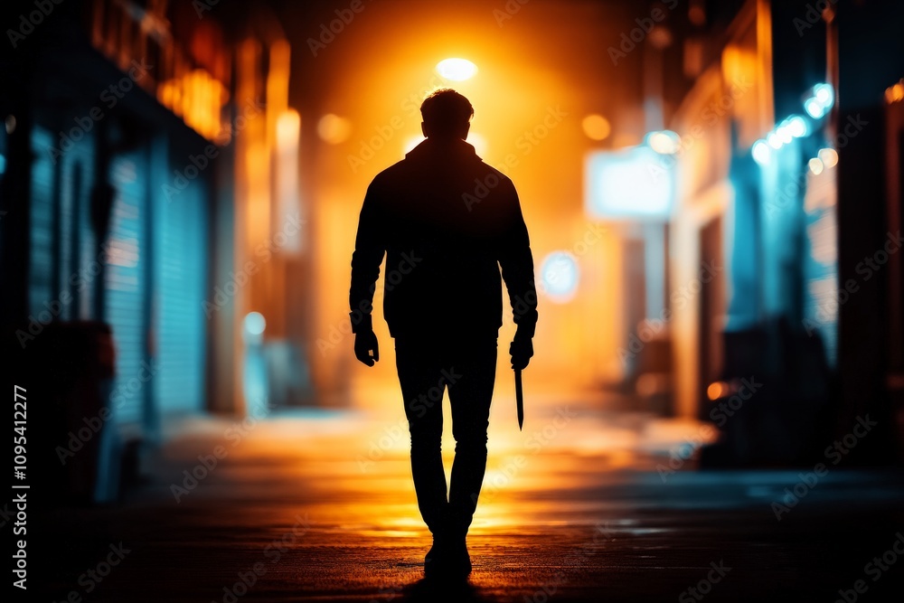 The silhouette of a man walking confidently down an alleyway while holding a knife, highlighted by intense yellow and blue lighting, creates a suspenseful ambiance. #1095412277