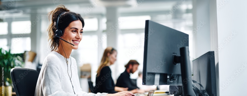 The smiling woman in an office using a headset at her computer desk. #1624646796