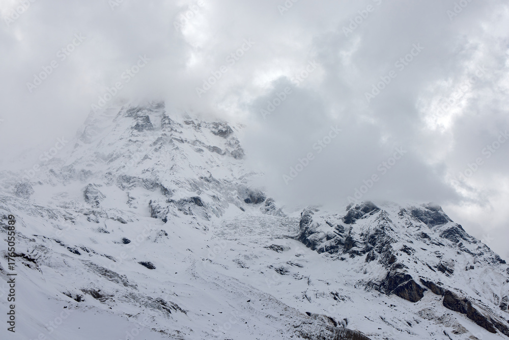 The snow-covered peaks of the Himalayas are partially obscured by thick clouds. The landscape of Annapurna Sanctuary is visible in Nepal. #1765055889