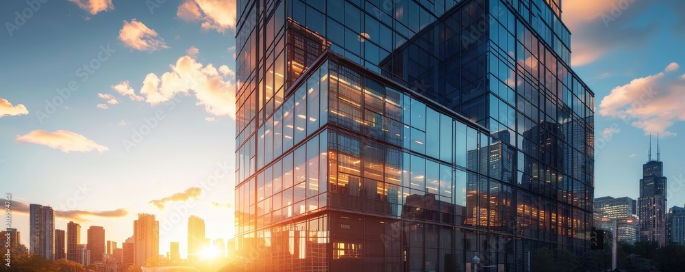 The sunset hues reflecting on the smooth glass surfaces of urban skyscrapers in a cityscape. banner #809574762