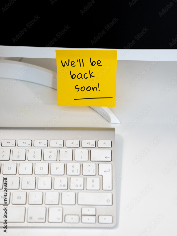 The temporary break message We'll be back soon written on a yellow sticky note attached to a computer screen #1943243258
