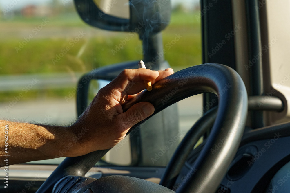 The truck driver holds a smoldering cigarette in his hands and controls the steering wheel of the car at the same time. #637541426