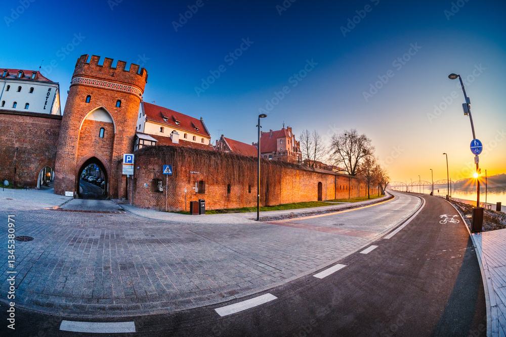 the Vistula River promenade in historic Torun bathed in enchanting sunset hues #1345380971