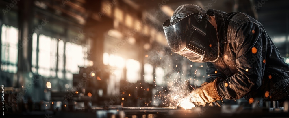 The welder carefully creates sparks in a busy industrial workshop environment. #1541820358