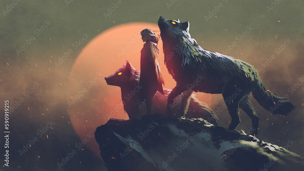 The woman in the cloak standing with her two wolves, digital art style, illustration painting #590919215