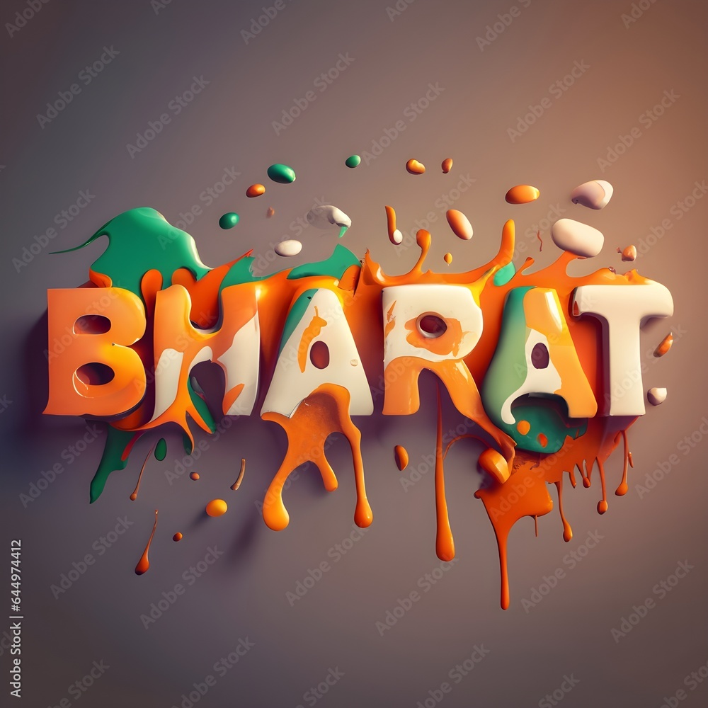 The word BHARAT, with Indian paint colors splashing: orange, white, and green . Realistic , High details , dark background, creative image , 3d render. #644974412