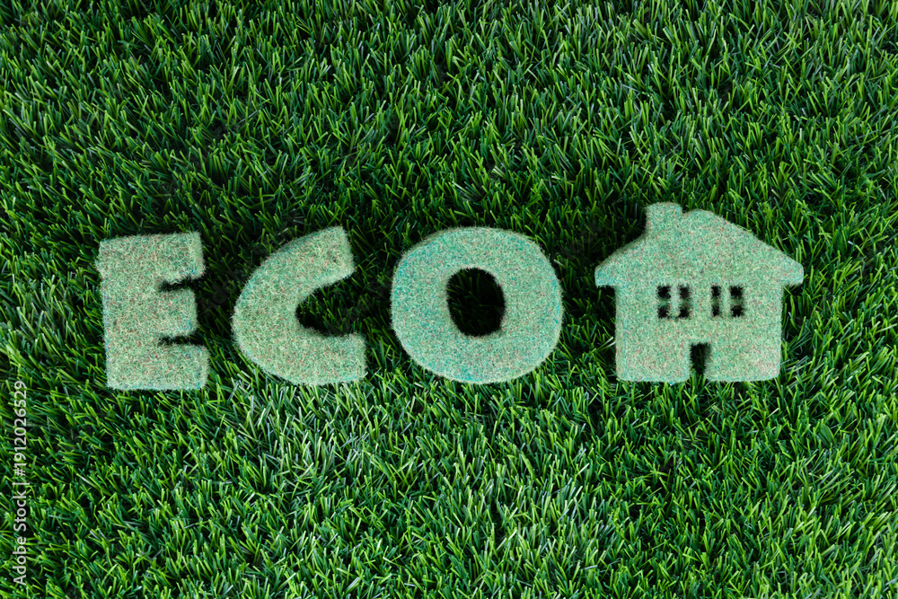 The word eco from volumetric green letters is laid out on the grass. A miniature copy of the house on a background of grass. #1912026529
