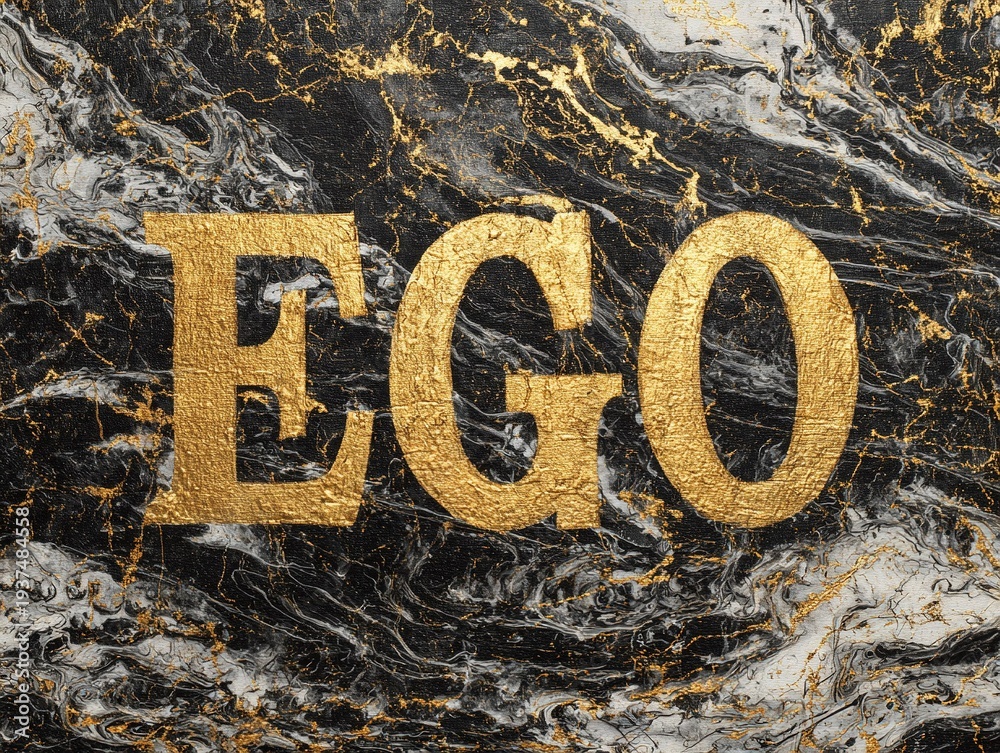 The word EGO in gold letters with a handcrafted texture on a dark abstract background with gold details, creative luxury, identity and visual power ideal for artistic design and modern backgrounds. #1937484558