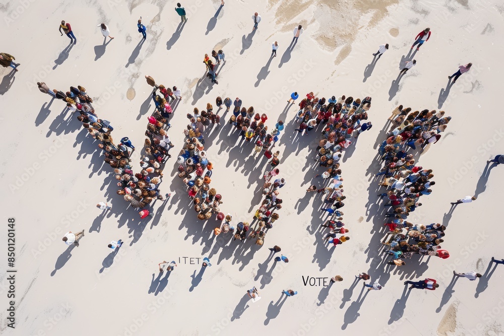 The word Vote is made of people standing and gathered together. aerial view of humans. #850120148