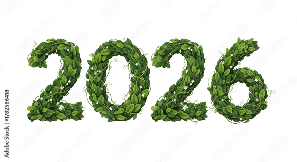 The year 2026 creatively formed from lush green leaves and vines, suggesting nature and growth #1782566418
