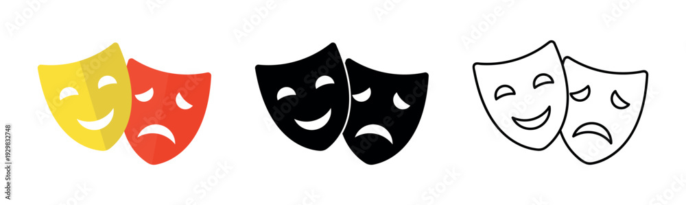 Theater masks icon set. Masquerade vector icons. Comic and tragic mask icons. Happy and unhappy traditional symbol of theater. Funny and sad theater masks. Vector Illustration #1929832748