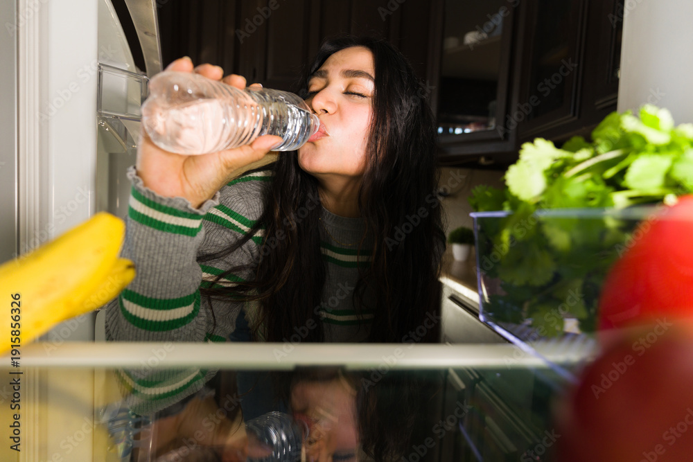 Thirsty young woman drinking water from a bottle at night inside open fridge, staying hydrated #1915856326
