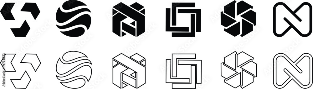 This abstract geometric icon set features diverse of modern designed with clean lines, balanced shapes, and creative sigs. This includes a, squares, hexagons, grids, waves, spirals, and layered patter #1967381572
